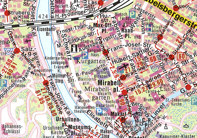 The map includes a full index on the reverse side and tourist information and places of interest are clearly marked by a range of icons. There is also an inset map showing an enlargment of the city centre in better detail and another inset showing Salzburg and its environs.