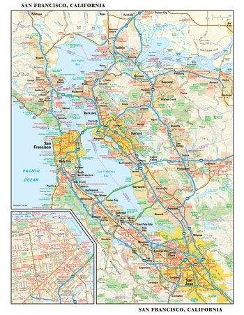 The regional map includes the major metropolitan areas of San Francisco, Oakland, and San Jose. The area's cities and towns, highways and roads, and a variety of points of interest are depicted.