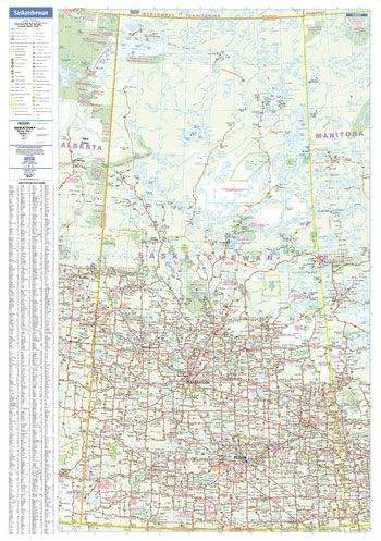 Wall Map of Saskatchewan showing political boundaries, place names, highways, major parks and conservation areas, and points of interest.
