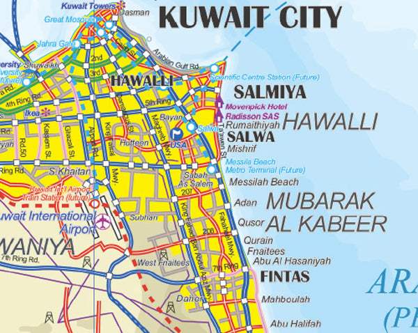 The side showing the southern part of Saudi Arabia includes a separate panel covering Kuwait at 1:390,00, with latitude and longitude at 30' and not indexed, plus a street plan of central Kuwait City.