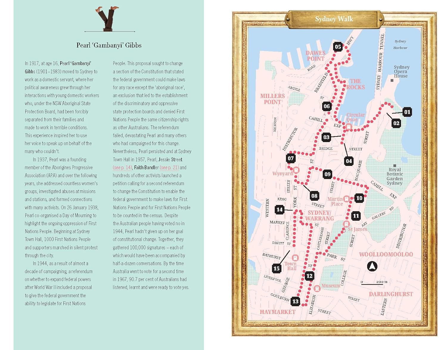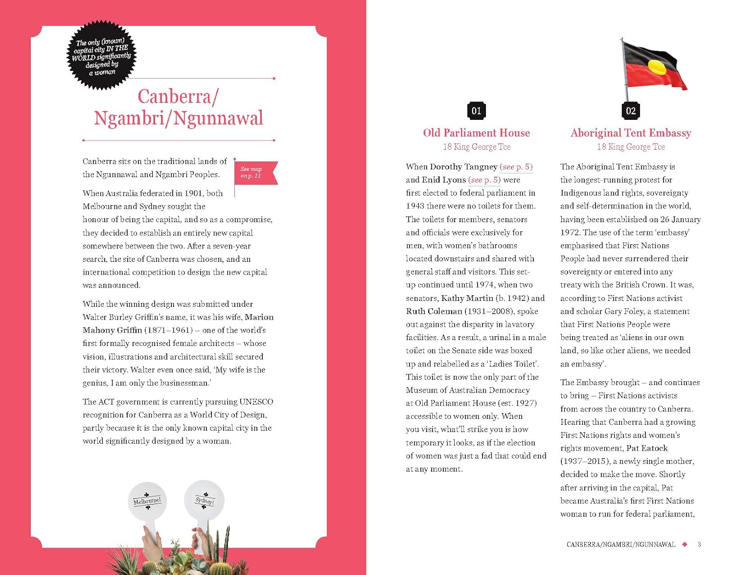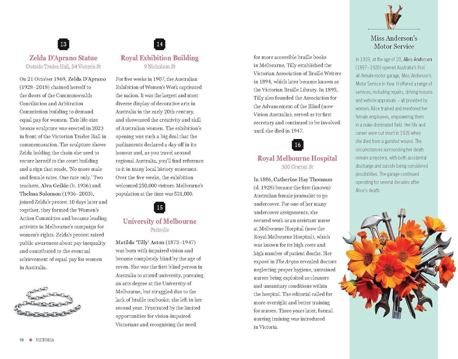 The book features 30 cities and towns from across the country; from Coober Pedy to Hobart, Hahndorf to Rockhampton, and all of the major cities in between, each place has its own indelible identity, and a myriad women who left their mark there. Whether it's the underworld queens who ran Kings Cross, the businesswoman of African heritage and single mother of four who became the first recorded woman to vote in an Australian election, or the pioneering activist who founded Meals on Wheels (and just happened to be in a wheelchair), there are countless funny, heartbreaking, inspiring, and eye-opening stories of women who lived and thrived in these disparate and often challenging landscapes.