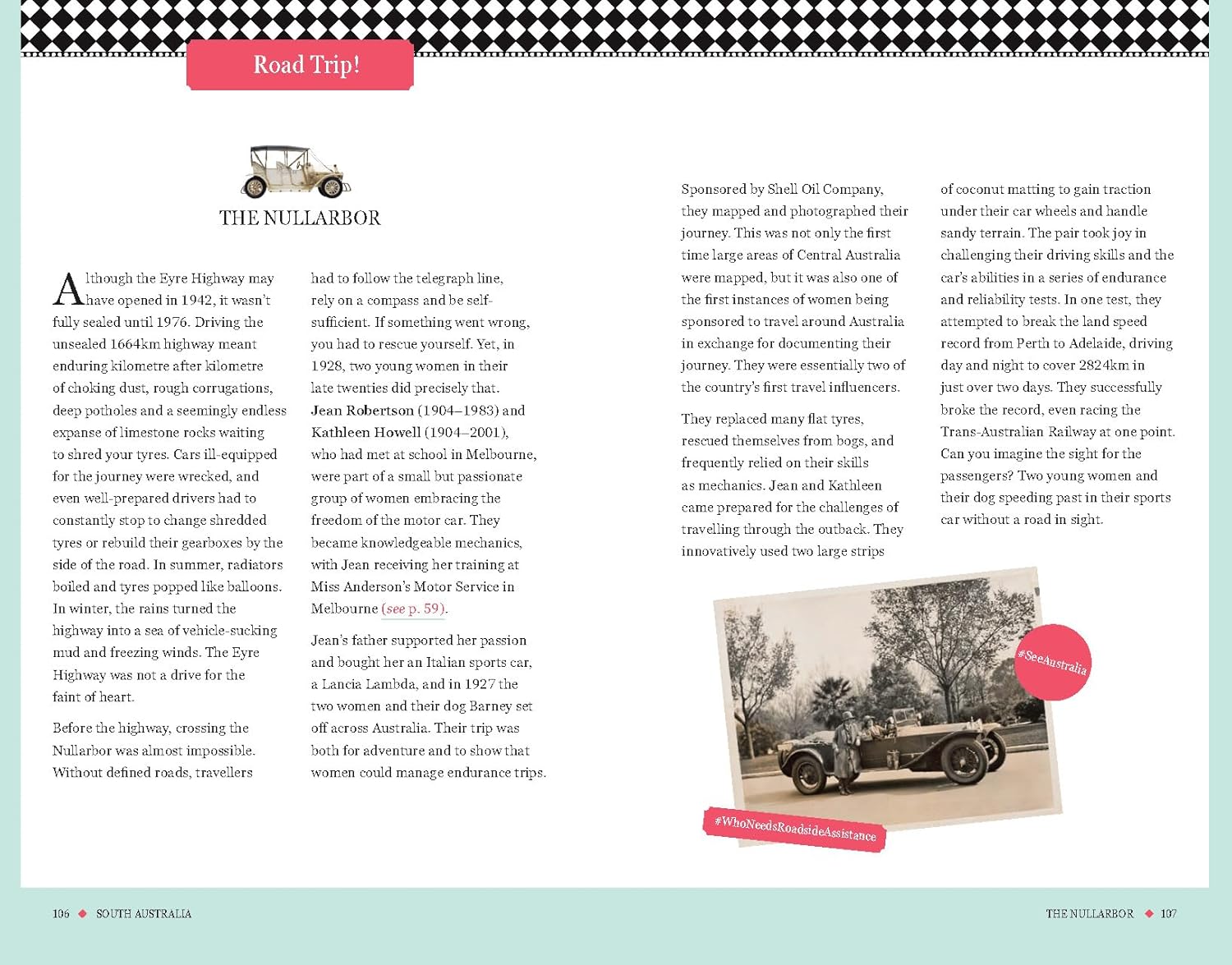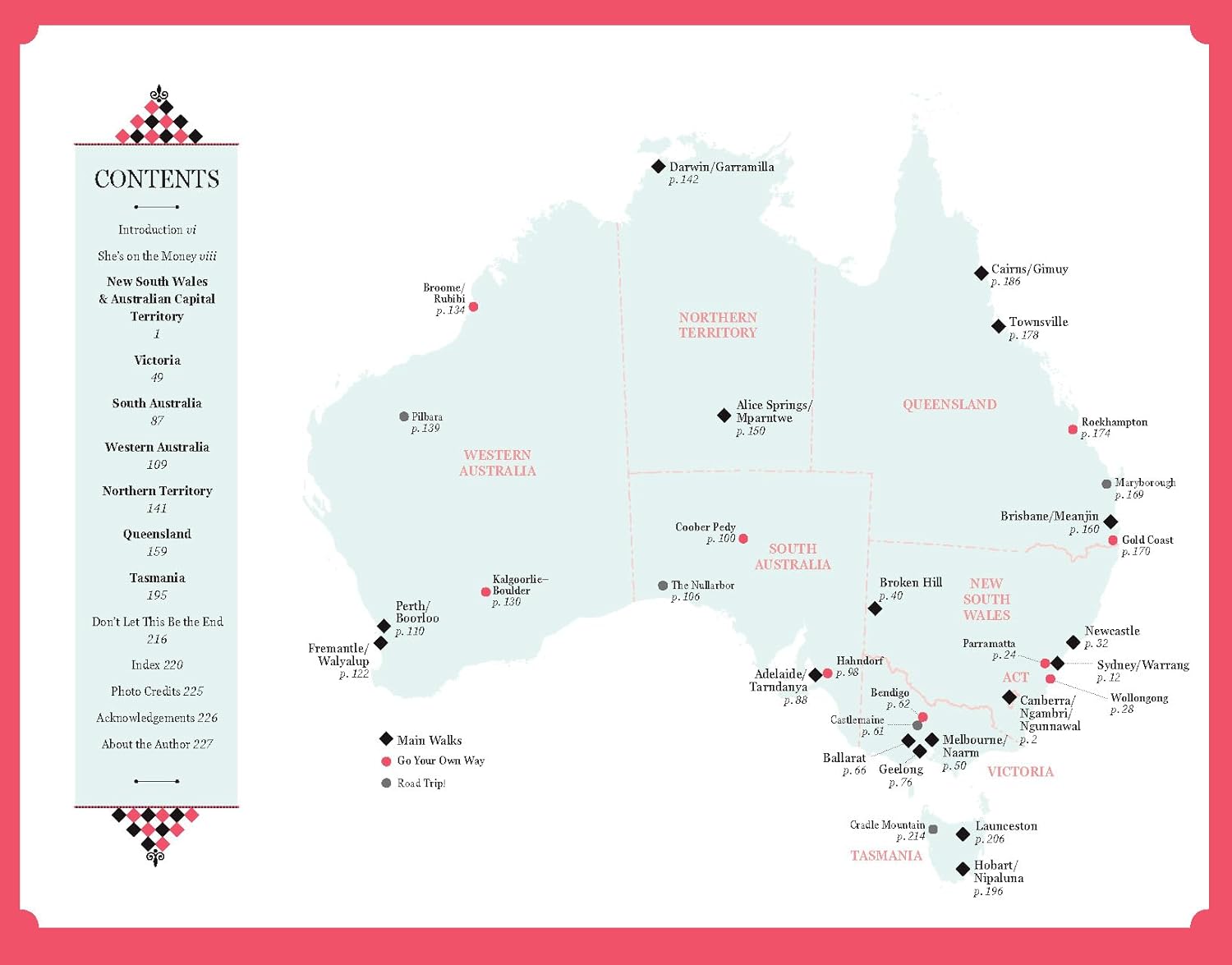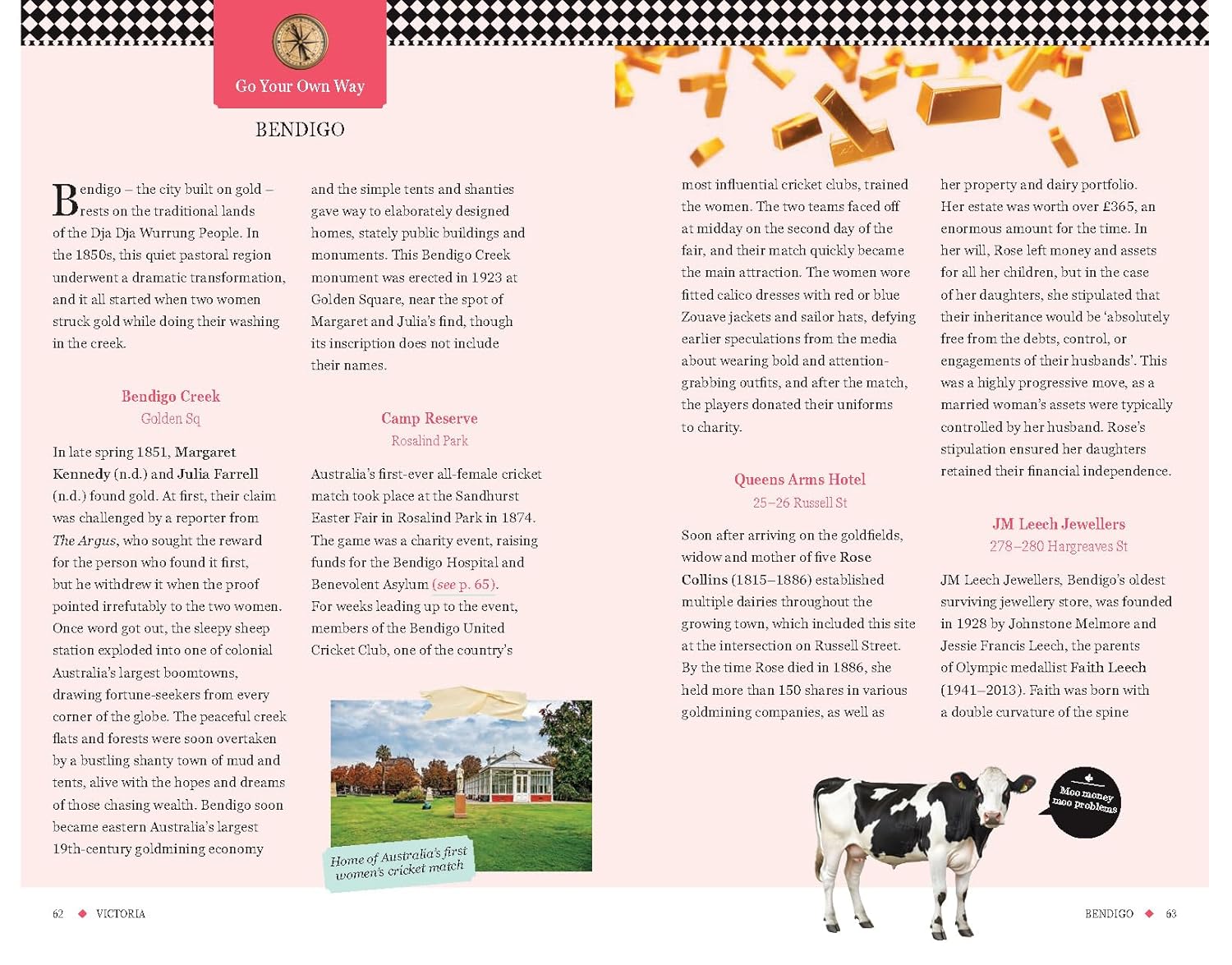 The book features 30 cities and towns from across the country; from Coober Pedy to Hobart, Hahndorf to Rockhampton, and all of the major cities in between, each place has its own indelible identity, and a myriad women who left their mark there. Whether it's the underworld queens who ran Kings Cross, the businesswoman of African heritage and single mother of four who became the first recorded woman to vote in an Australian election, or the pioneering activist who founded Meals on Wheels (and just happened to be in a wheelchair), there are countless funny, heartbreaking, inspiring, and eye-opening stories of women who lived and thrived in these disparate and often challenging landscapes.