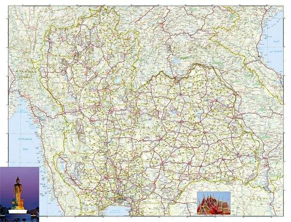 The front side of the Thailand map shows the northern half of the country and extends south to the capital city of Bangkok. Border crossings are noted, as are many sites of interest in the neighboring countries of Laos, Myanmar (Burma), and Cambodia. The reverse side features the southern provinces located on the Malay Peninsula.
