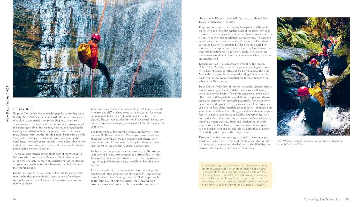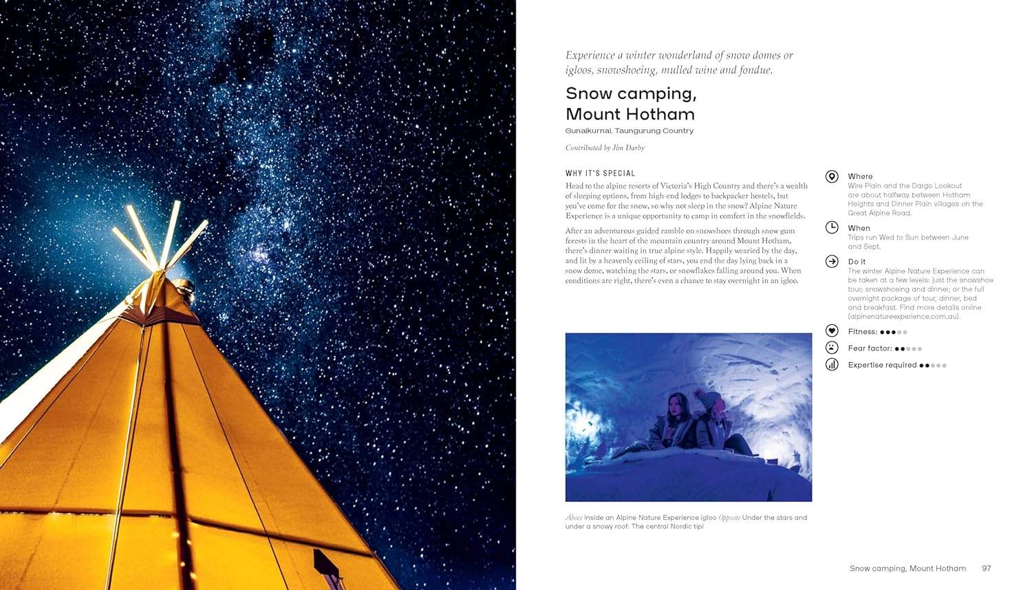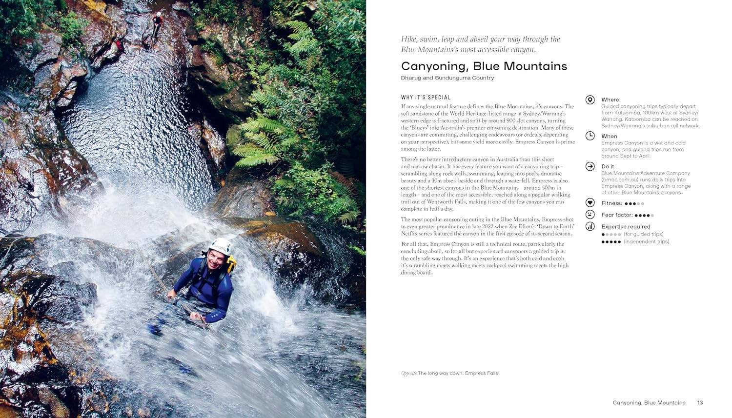 All of the adventures featured in this book are guaranteed to get your blood pumping, but don't require years of practice. You'll discover memorable wildlife interactions like camel trekking in the Flinders Ranges and swimming with the whale sharks at Ningaloo Reef, invigorating water-based fun like kayaking in Sydney Harbour and canoeing through Nitmiluk Gorge, sandboarding at Lancelin, heli-mountain biking in Alice Springs, and snow camping at Mount Hotham.