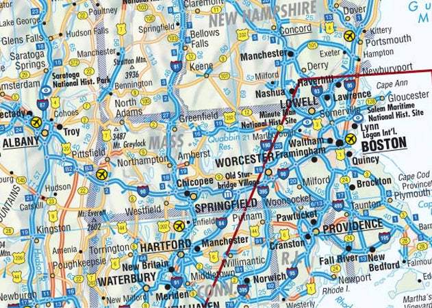 This soft-laminated folded map of Northeast-USA - New York & Great Lakes shows: Northeast USA 1:3 000 000, Greater Boston 1:1 000 000, Central East Coast 1:1 000 000, Boston 1: 14 000, New York City 1:20 000, Washington DC 1:15 000, USA administrative & time zones.