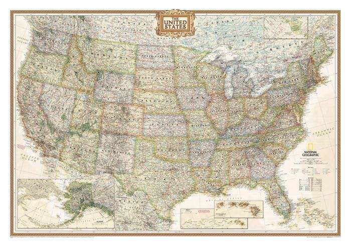 National Geographic's Executive reference map of the United States features all 50 States with insets for Alaska and Hawaii in antique-executive cartographic style. Each state is colored to clearly define borders and shaded relief accentuates geographical features. All major cities, transportation routes, state boundaries, National Parks, lakes and rivers, and mountain ranges are clearly displayed and labeled.