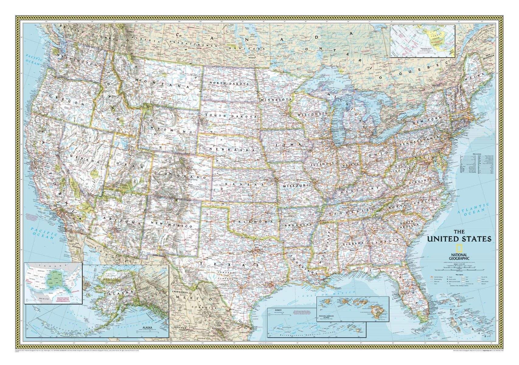 The signature Classic style United States map uses a bright, easy to read color palette featuring blue oceans and stunning shaded relief that has been featured on National Geographic wall maps for over 75 years. All 50 States are featured including insets for Alaska and the Hawaiian Islands.