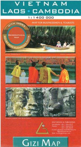 Vietnam, Laos and Cambodia at 1:1,400,000 from Gizi Map with bold altitude colouring providing a vivid picture of the region's topography, highlighting for places of interest including diving sites, an index of localities, etc.