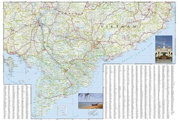 The front side of the Vietnam South map details the lower central region of the country, from its border with Laos and Cambodia to the west, to the mouth of the Gulf of Tonkin to the east. The reverse side of the map details the southern region, from its border with Cambodia to the west, the South China Sea to the east, to the Gulf of Thailand to the south.