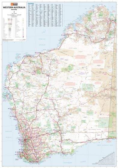 A state map of Western Australia that is an ideal travel reference and wall map.