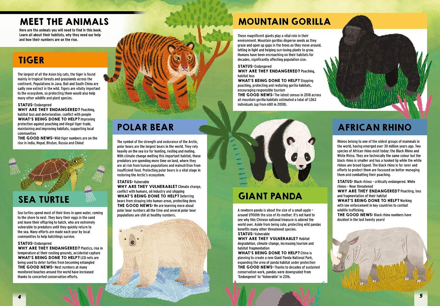 Find 12 beloved animals hidden throughout the book. Learn all about their habitats, why they need our help and how their numbers are on the rise.