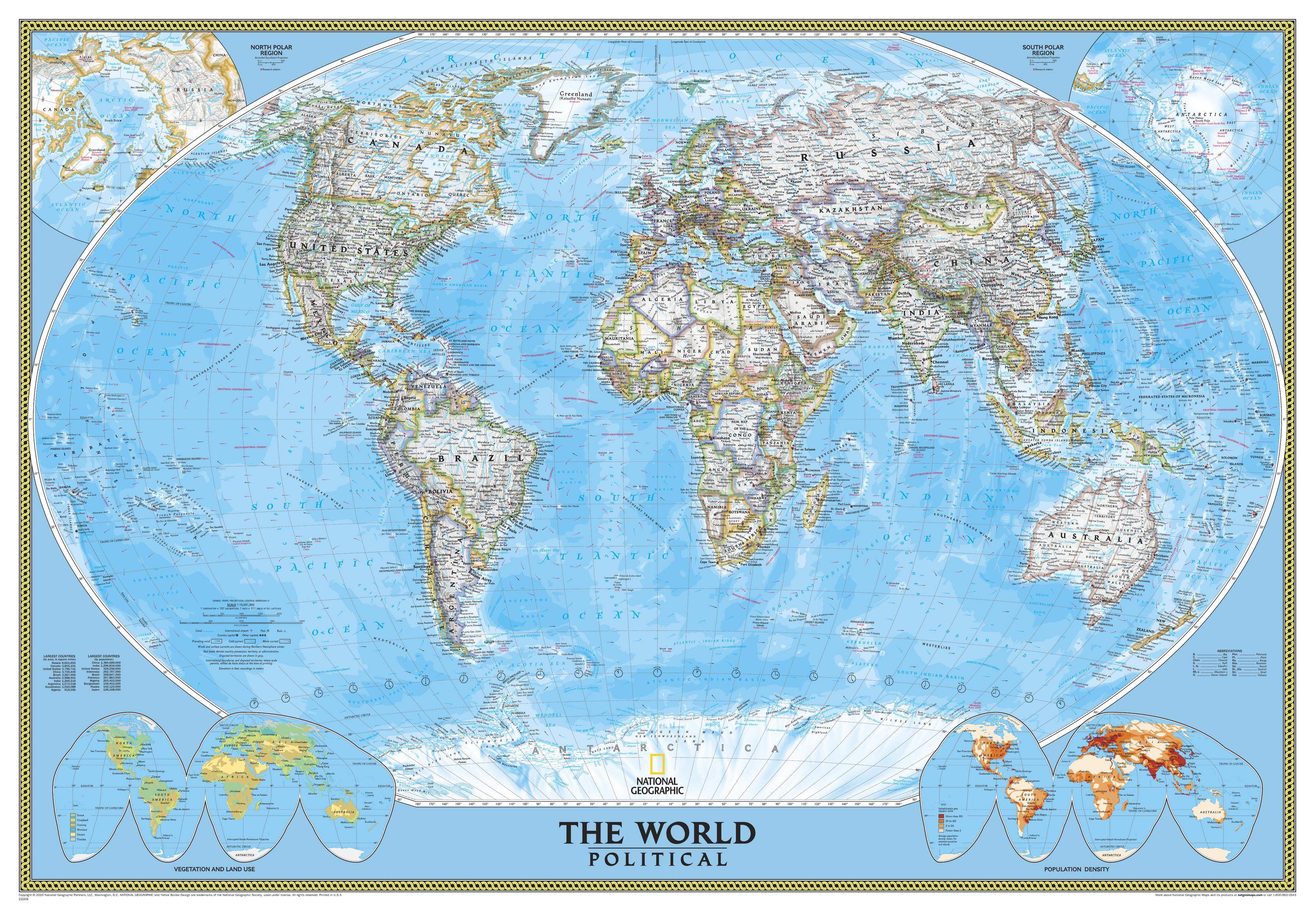 This world map features the Winkel Tripel projection to reduce distortion of land masses as they near the poles. Features include subtle border colouring on land, and prevailing winds and ocean currents at sea. Separate insets show the North and South Polar Regions, world vegetation and land use, and world population density. This is the same as the standard size National Geographic World Political map, just bigger.